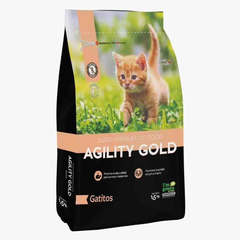 La línea de productos Agility Gold gatos es una línea de alimentos Súper Premium, fabricados con la mejor tecnología que existe hoy en el mercado internacional. Con seleccionados ingredientes, incluyendo como principal ingrediente carne real de Pollo, Salmón y cordero. Así garantizamos a nuestras mascotas un alimento con nutrición de la más alta calidad, la mejor palatabilidad, lo que significa tener nutricionalmente los mejores productos para las diferentes etapas de vida de los gatos, satisfaciendo sus requerimientos nutricionales con excelencia. Agility Gold utiliza ingredientes que favorecen la salud intestinal, fortaleciendo las vellosidades intestinales, mejorando absorción de nutrientes, al tiempo que estimula el sistema inmunológico en cada etapa de la vida de nuestras mascotas. Los productos para gatos de Agility Gold buscan la preservación del pH urinario en niveles adecuados y así prevenir patologías renales, al mismo tiempo la eliminación de bolas de pelo tan problemáticos para ellos.